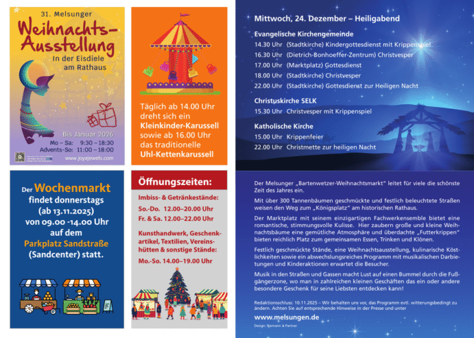 Evangelische, katholische und die Selbständige Evangelisch-Lutherische Kirche (SELK) laden wie im Programmheft dargestellt zu Krippenspielen, Christvespern und Gottesdiensten ein – von nachmittags bis zur „Heiligen Nacht“ um 22 Uhr.